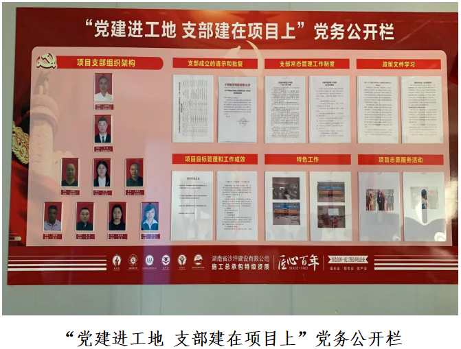 2022年9月,项目成立了流动党支部,由建设单位、监理单位、总承包单位等三方共同建立,支部共有党员11人,设立支部委员5人,党支部书记肖琼辉、副书记李刚。支委班子配备齐全,组织架构明晰管理制度健全,阵地建设规范完整。