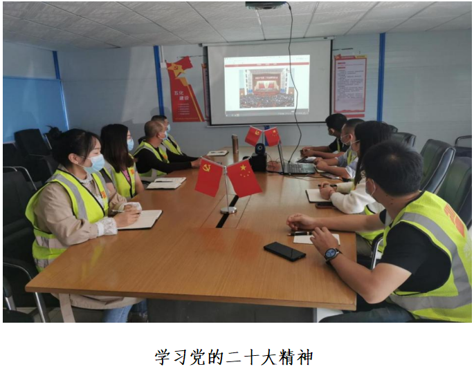 项目部一直把党员思想政治工作作为重点工作之一,通过多种方式提高党员干部自身素质,每月制定党员干部学习安排与计划,规定党员干部学习的重点内容、方法和步骤,组织党员干部深入学习贯彻党的二十大精神,就要深刻把握全面建成社会主义现代化强国总的战略安排和未来五年的主要目标任务,牢牢把握“坚持和加强党的全面领导”“坚持中国特色社会主义道路”“坚持以人民为中心的发展思想”“坚持深化改革开放”“坚持发扬斗争精神”的重大原则,埋头苦干、担当作为,不断推进社会主义现代化建设。