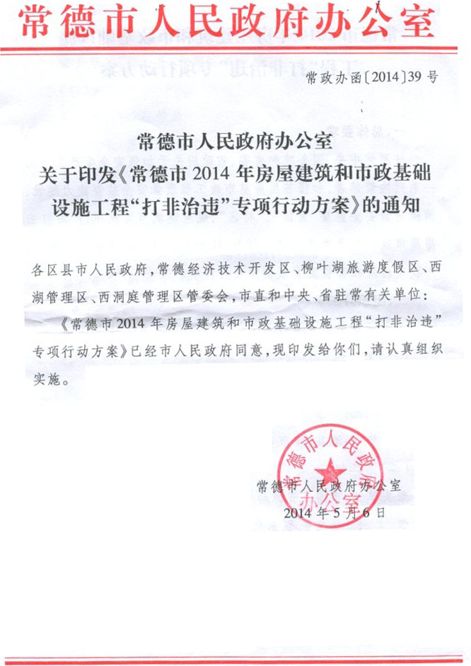 常德市政府办关于印发《常德市2014年房屋建筑和市政基础设施工程“打非治违”专项行动方案》的通知