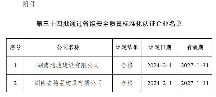 根据《关于印发湖南省建筑施工企业安全质量标准化认证实施办法的通知》(湘建协〔2016〕11号)的规定,在省住房和城乡建设厅有关部门的指导监督下,省安全认证中心按照程序开展了我省第三十四批建筑施工企业省级安全认证工作。经过组织专家进行资料初审、现场核查、项目抽查、安全认证评审、结果公示,确定湖南通驰建设有限公司等2家建筑施工企业为第三十四批通过省级安全质量标准化认证企业。现予公布。