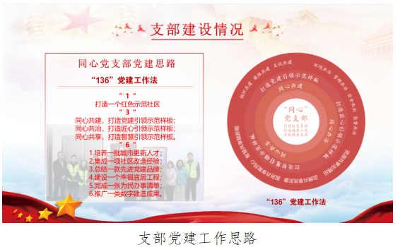 支部以项目作为长沙市中心城区城市更新重点改造项目为切入口,以坚持走好党的群众路线为落脚点,倡导思想上同心同德、目标上同心同向、行动上同心同行,探索打造以“政企心心相通、地企心心相依、居企心心相连”的“同心惠民”理念,并以“同心共建、同心共治、同心共享”为抓手,总结形成了“136”特色党建工作法。“1”即:打造一个红色示范社区。“3”即:同心共建,打造党建引领示范样板;同心共治,打造匠心引领示范样板;同心共享,打造智慧引领示范样板。“6”即:1.培养一批城市更新人才;2.集成一项社区改造经验;3.总结一款先进党建品牌;4.建设一个幸福宜居工程;5.完成一张为民办事清单;6.推广一类数字建造成果。